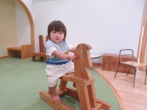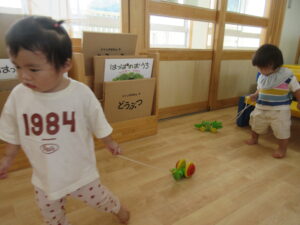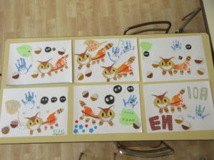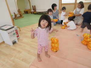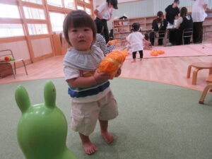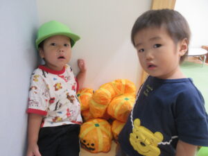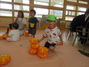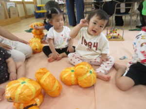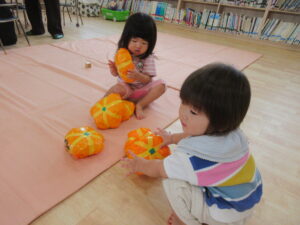 急遽参加してくださった方もあり、お部屋の中が一気に賑わいました。手形足形製作では、お母さんたちが協力して、パーツごとに担当を決めたり、製作係と子どもと遊ぶ係と分担したりして、工夫されていました。お友だちは顔見知りの子が多く、誘い合って遊んでいました。かぼちゃの積み上げゲームでは、1歳のお友だちも上手に積み上げていて、「見てみてー!」とと次々に声が上がり盛り上がりました。積み上げて満足した後、お部屋の片隅に運んで、かぼちゃ屋さんになって楽しんでいるお友だちもいました。