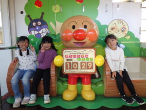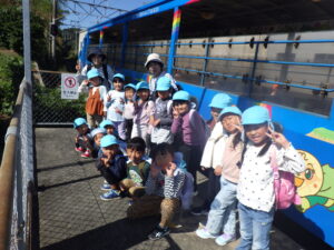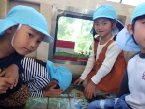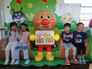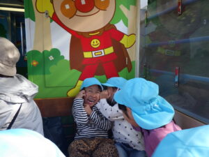 10月29日(水)、くま組が心待ちにしていたアンパンマントロッコ列車遠足に行きました。行きはトロッコの車両に乗り、あちこちに置いてあるアンパンマンのキャラクターや仕掛けに喜んでいました。ガラスになっている床をのぞいたり、トンネルになると他園の友だちと一緒に「わ~!!!」と歓声をあげたり満喫していました。