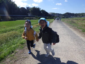 公園までの道のり、まっすぐのあぜ道を全力で走ったりミカンや柿の木を見たりしながら山道を登りました。