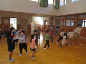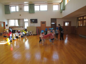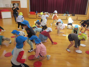 各園が運動会で踊ったダンスを一緒に踊ったり、オセロゲームや荷物運びゲームをしたりしました。三津浜幼稚園の友だちとペアになって力を合わせたり、対抗したりと体を動かしながら交流を楽しみました。