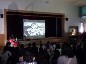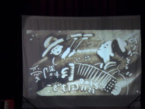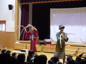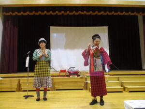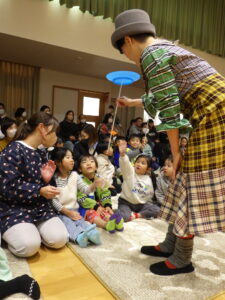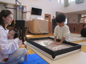サンドパフォーマーの田村祐子さんとチンドンたまむしやのうめこさんとの愉快なミニコンサートでバザーが始まりました。子どもも大人もすぐに引き込まれ、皿回しや楽器の演奏などにも参加させてもらい、お二人の素敵なコンビネーションで楽しい時間となりました。