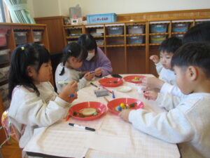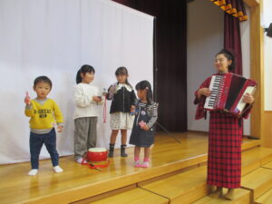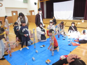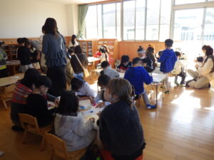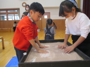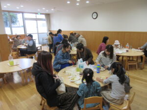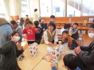 愛隣名物のたこ焼き・カレーライス・クッキーは定番になりました。また三津教会は、新たに加わったNPO法人イクソスと一緒に手作りのピザ・ポップコーン・綿菓子などが販売され好評でした。プラバンや芋づるのクリスマスリース、保護者から頂いたどんくりや木のコースターで製作コーナーも賑わいました。砂絵の体験コーナー、ゲームコーナーやプレイコーナーも家族のみなさんと楽しむ姿がたくさん見られました。地域の方々がたくさん来てくださって嬉しかったです。