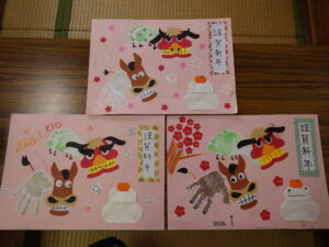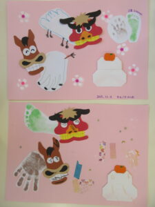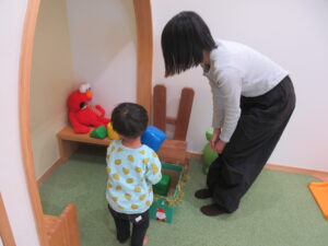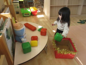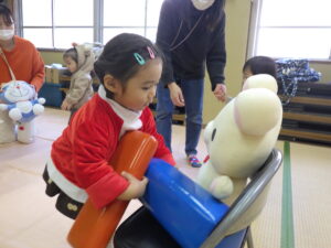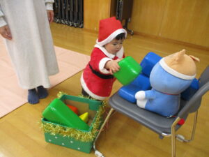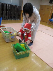 トナカイやクリスマス仕様の服装で来てくださったお友だちもいました。園から持って来ていたサンタクロースやトナカイの服装を羽織って、ソリにプレゼントをたくさん乗せたり、手でひとつずつ運んだりして楽しみました。好きなキャラクターのぬいぐるみにたくさんのプレゼントが集まって、人気投票みたいになっていて面白かったです!クリスマスは終わりましたが、みんなのお家にもサンタさん来たかな~?♪また、来年度会えるのを楽しみにしています。今年もお世話になりました。良いお年をお過ごしください。
