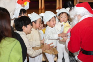 今年もサンタの登場に大喜びです。一人ひとりへの手渡しのプレゼント、サンタさんありがとう。来年も来てくださいね。
