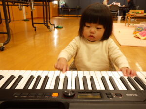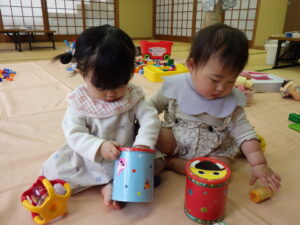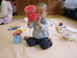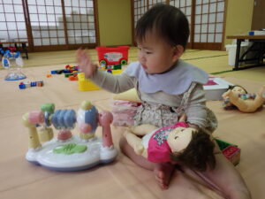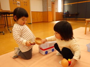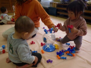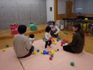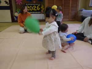 三津浜公民館では、顔なじみのメンバーで、お友だち同士の関わり合いがよく見られました。ままごと遊びや、職員が弾いているピアノが気になっているお友だちもいて、じっくり楽しみました。最後の的当てゲームでは、鬼の的にも怖がらず、近づいていました。高浜公民館では、お友だちの真似をしてして楽しむ姿がみられました。最後の風船遊びでは、ぶるぶると風船が回るのを楽しんでいる写真が撮れました。