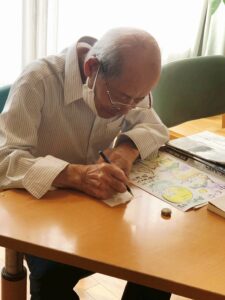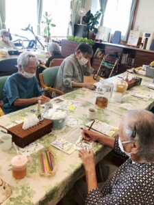 皆さん思い思いに見本を元に筆を動かし、彩りを加え、秋の夜空に浮かぶお月さまやすすき等を描かれていました。