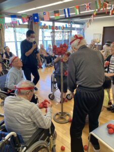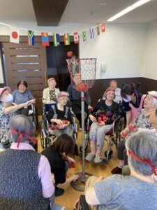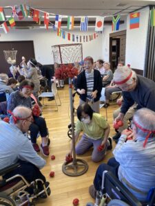 ラジオ体操から始まり、玉入れ、ボール送りリレー、パン食い競争、職員による飴食い競争が行われ、運動会は大変盛り上がり、皆様 真剣に種目に参加されていました。