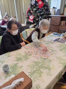 事前に準備した「あ」から「ん」までのひらがなの札を使用し、季節のお題に対し、皆様で協力して正しいひらがなの札を順番に並べていくというものです。