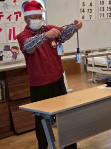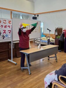 バラバラにちぎれたはずの紐が繋がり、棒に変身する紐の魔法、交差したリングがあざやかに繋がるリングマジック、コップの液体が一瞬で消失、新聞紙の不思議等、目の前で起こる「あり得ない」光景に身を乗り出して驚かれ、大きな拍手と歓声に包まれました。
