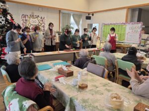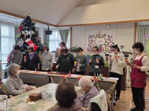 職員有志によるハンドベルチーム「ほわいとりりぃ」の訪問演奏があり、澄んだベルの音がホールに響き渡り、お馴染みのクリスマスソングで会場は一気にクリスマスムードに包まれました。