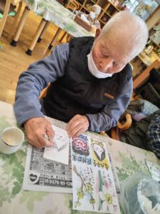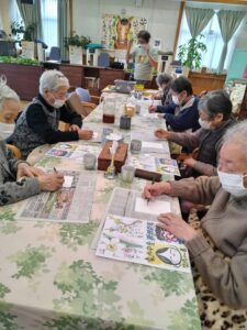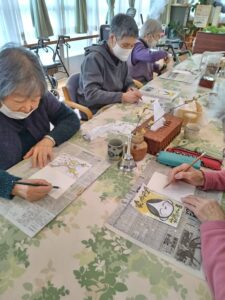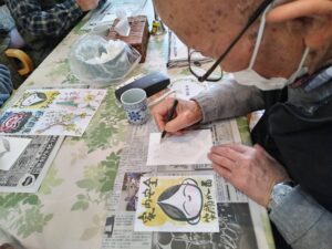 水仙や蝋梅といった季節の花々から、家内安全を願う「おたふく」まで皆様それおれ思い思いの原案を手に個性豊かな作品を描かれていました。