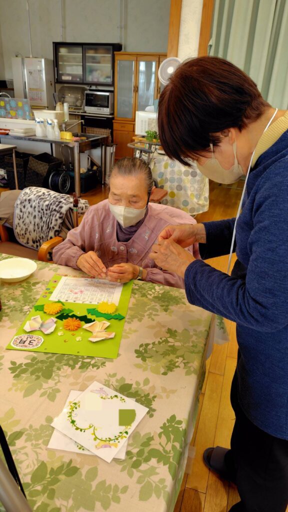 スタッフが台紙とパーツを用意して、思い思いに貼り付けてもらったり、色を塗ったりしていただきました。ハッピーサポーターさんにも協力していただきましたが、特にシールや両面テープを剥ぐのに手間取りました(笑)💦