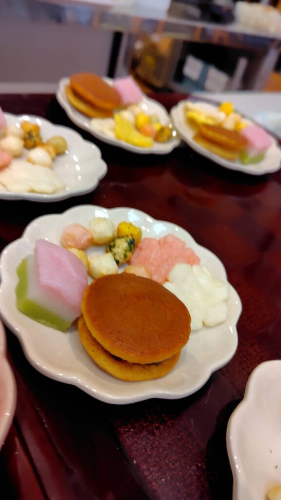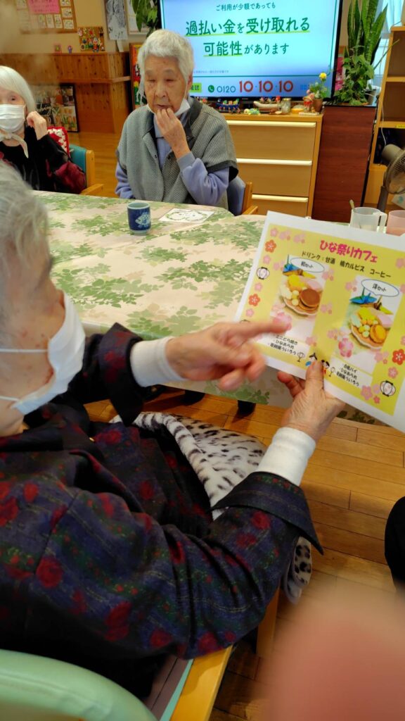 ハッピーサポーターさんにも協力していただいて、飲み物は甘酒、桃カルピス、コーヒー、お茶から、食べ物は和菓子(どら焼き)セットと洋菓子(桃パイ)セットから選んでいただき提供しました✨※お菓子セットには他ひなあられや花形のミニせんべい、ミニミニひしもちも付いています💖