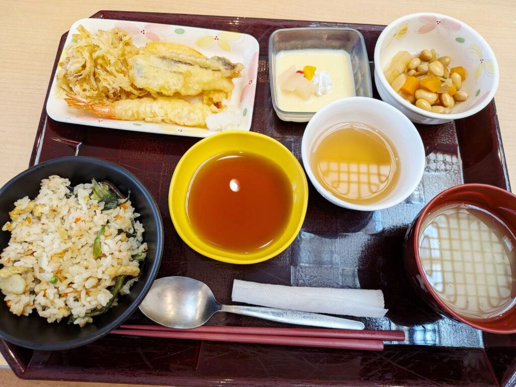 メニューは春の香りが広がる山菜の炊き込みご飯をはじめ、天ぷら4種、大豆煮、お味噌汁、そしてデザートのプリン!