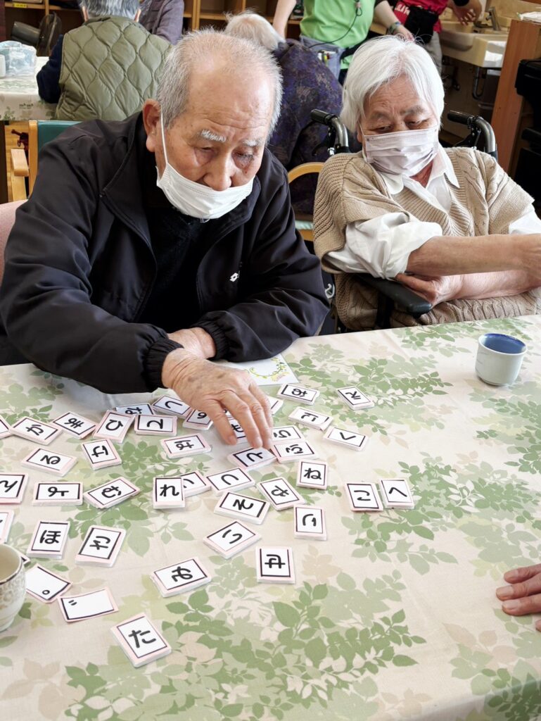 その後、各テーブルに五十音の手札を配り、グループ対抗の言葉作りゲームを行いました。