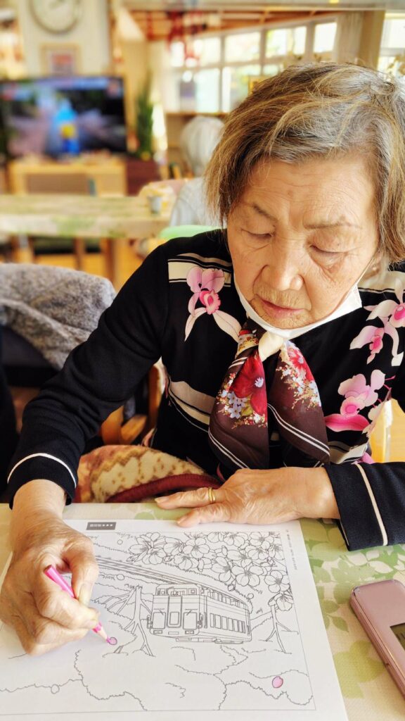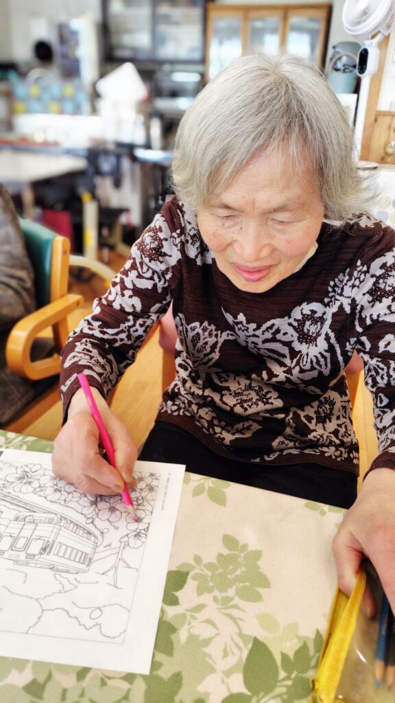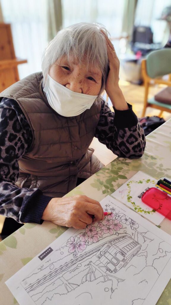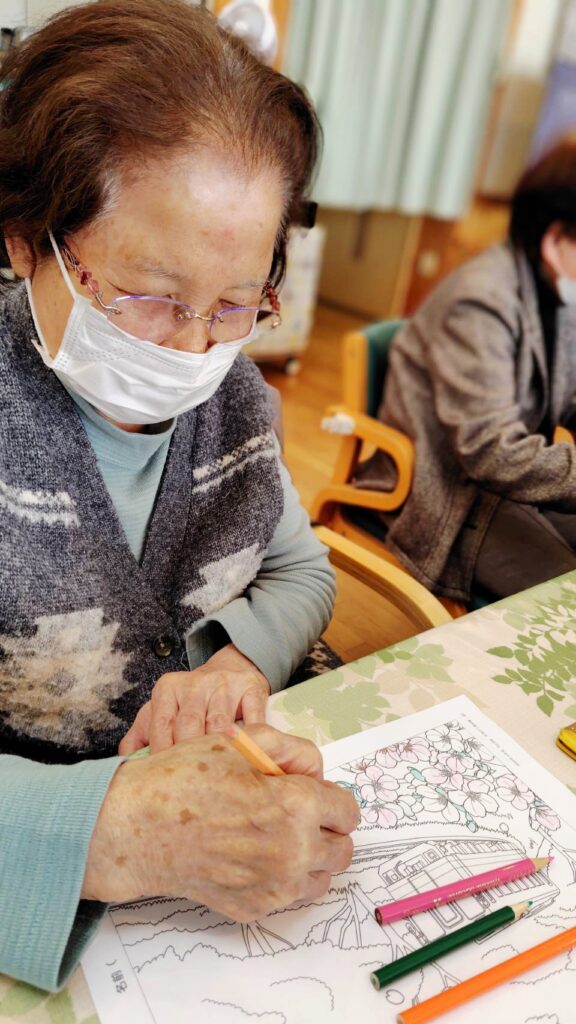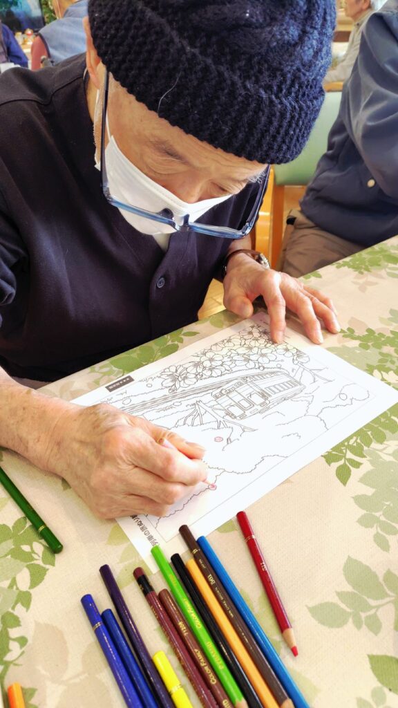 ぬり絵では春の草花や風景等の絵に思い思いの色を乗せていきます。